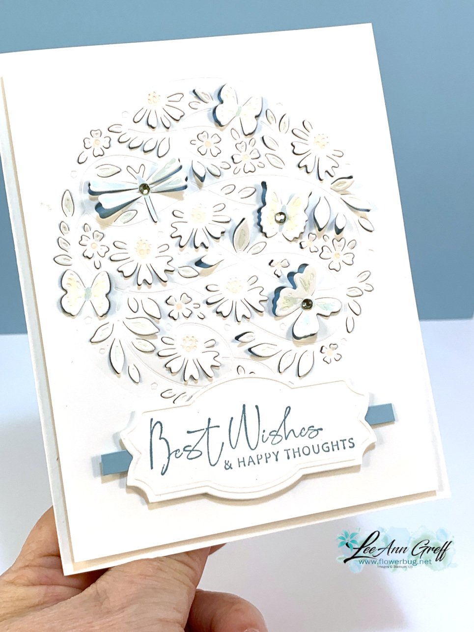 The greeting is stamped on a circle die from the Picture This dies and is from the Nature's Thoughts stamp set as well. There is a piece of Vellum card stock behind the Balmy Blue layer.