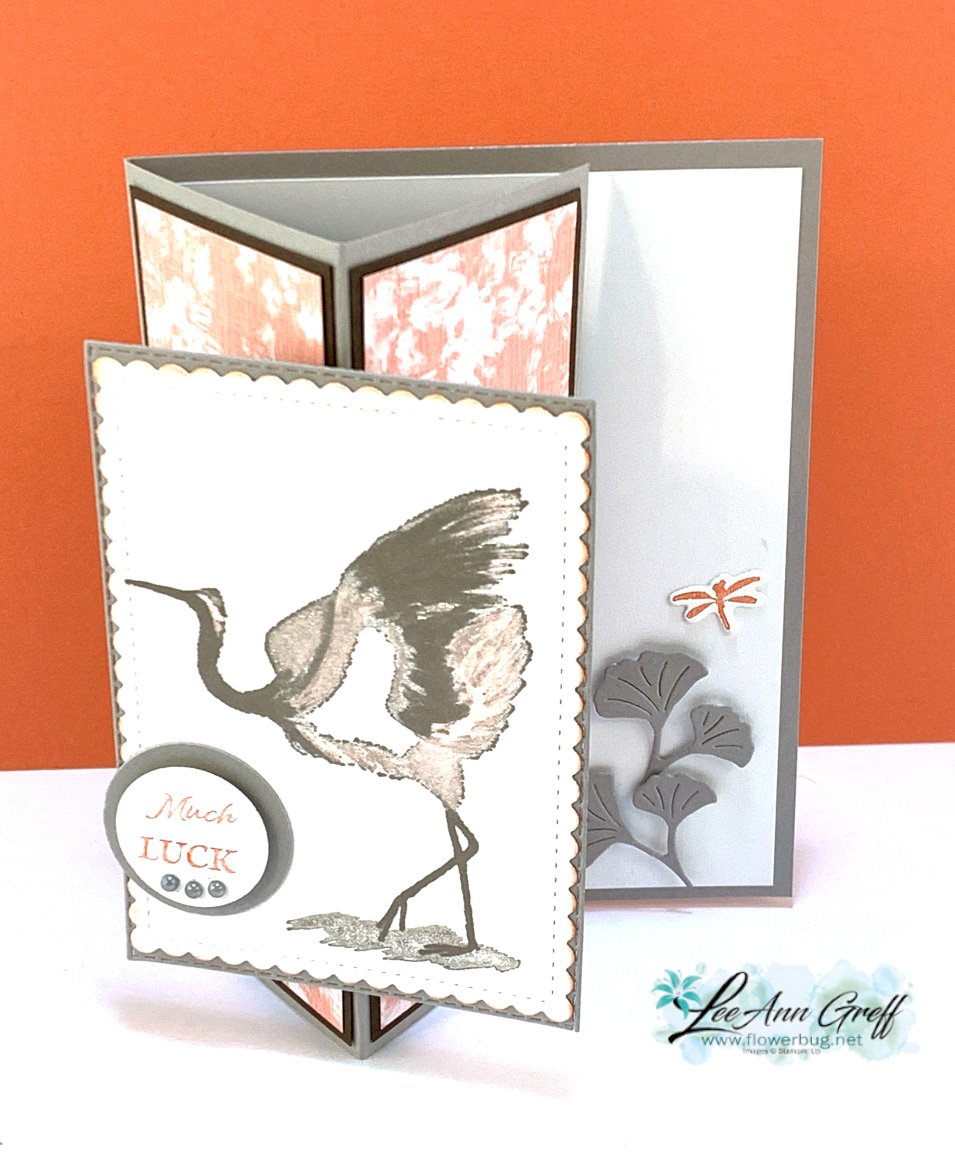 I used the Crane of Fortune bundle to create this card. The colors are so soft & pretty – Gray Granite, Calypso Coral, White & Early Espresso.