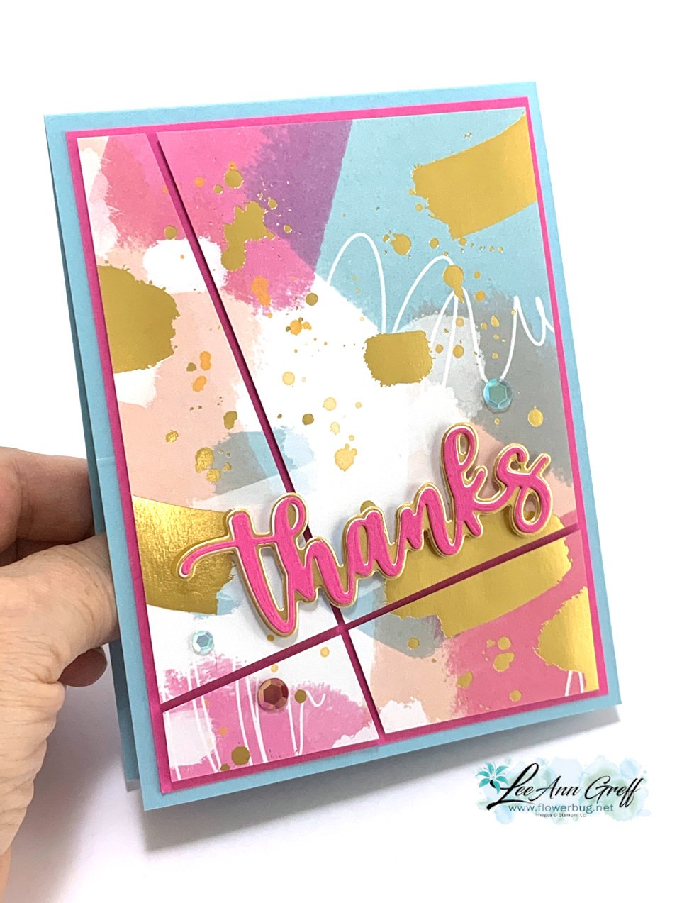 The card above features the Abstract Beauty specialty designer paper in the 2022 January-June catalog by Stampin' Up! It has splashes of color along with gold highlights. See it here.