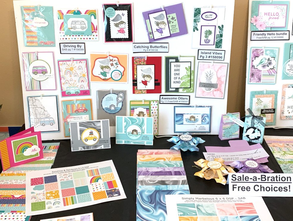 This first board features half of the Sale-a-Bration offerings including the Sunshine & Rainbows 6 X 6" DSP, the Driving By stamp set, Catching Butterflies stamp set, Simply Marbelous 6 X 6" DSP and the Island Vibes stamp set.