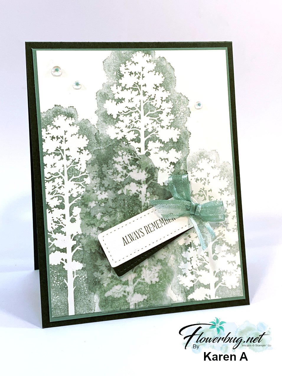She stamped the floral image three times on her White CS using Evening Evergreen ink.  The last one is stamped on Vellum and fussy cut.  She added a double tag die-cut from the Tailored Tags dies along with a bow in Soft Succulent ribbon.