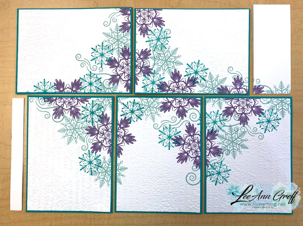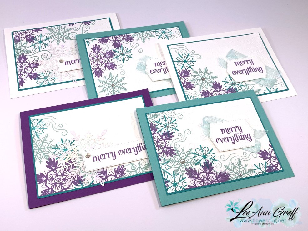 For these cards I used the Merry Snowflakes stamp set (seen here) & Pool Party, Bermuda Bay & Highland Heather inks. The card stock is White, Gorgeous Grape, Bermuda Bay & Coastal Cabana. If you follow me you know these are some of my favorite colors! They're perfect for snowflakes.