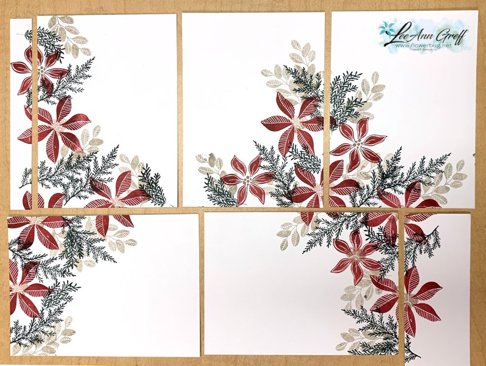 Can you see that the images concentrate on two sides of each piece leaving one corner free & clear? Basically you're stamping down the middle and on each of the lines. This keeps the cards from being too busy.