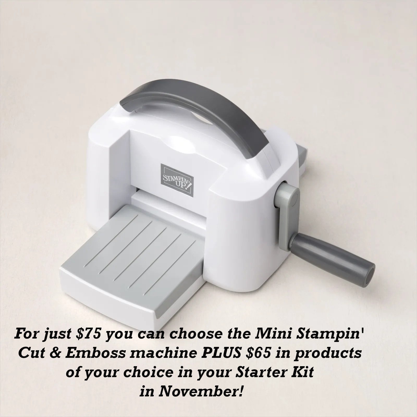 Or maybe you've been eyeing the Mini Cut & Emboss machine….?  It's a smaller version; nice & compact to fit on your work surface.  It has a $60 value and if you add this to your Starter kit you can add another $65 in product and pay just $75!  Crazy!
