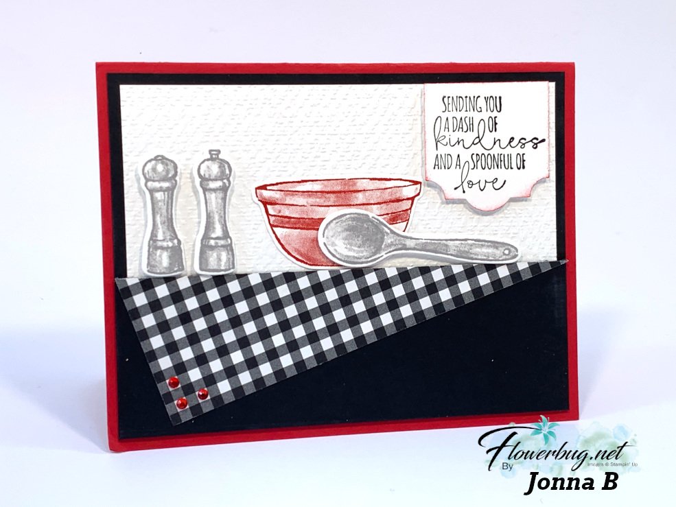 First is an amazing card made by Jonna.  She used the What's Cookin' bundle seen here.  I LOVE her colors and how she created a tablecloth from the patterned paper by placing it on an angle.