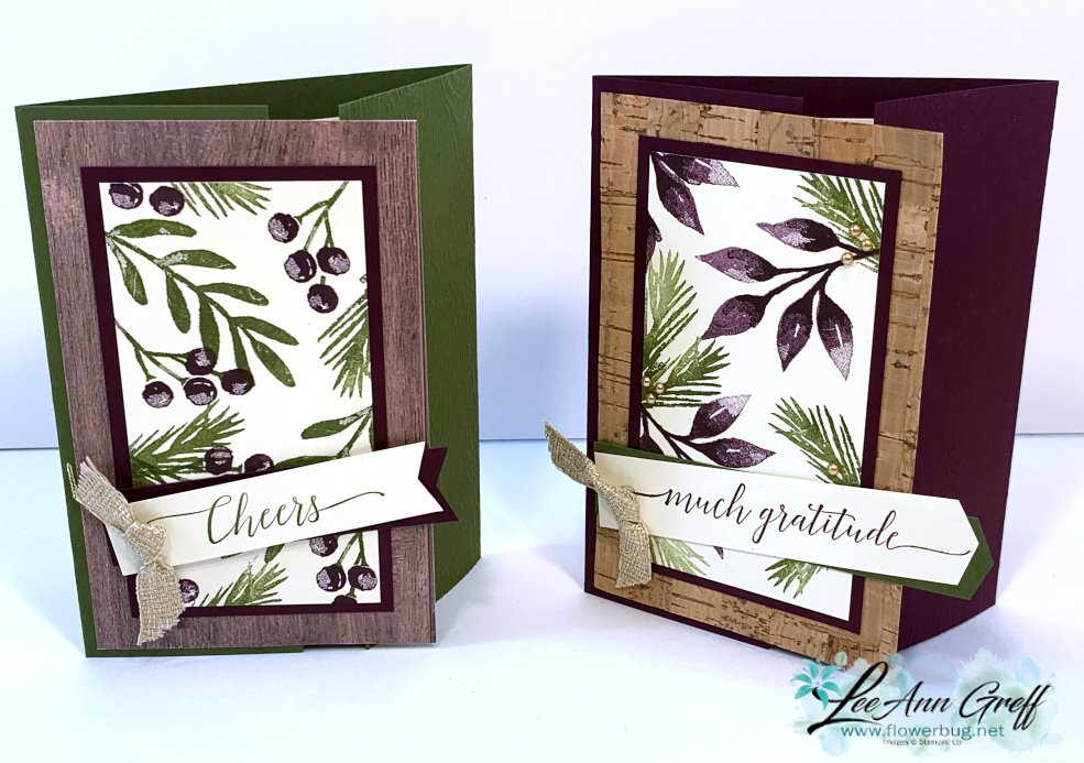 For these two cards I chose to use the In Good Taste DSP (Annual Catalog on the left) and Cork paper on the left from the Holiday catalog.