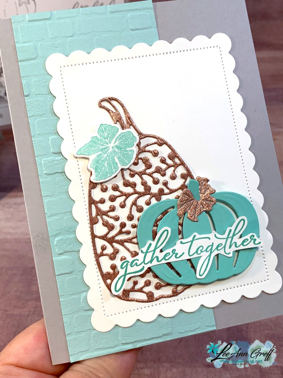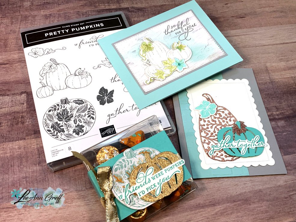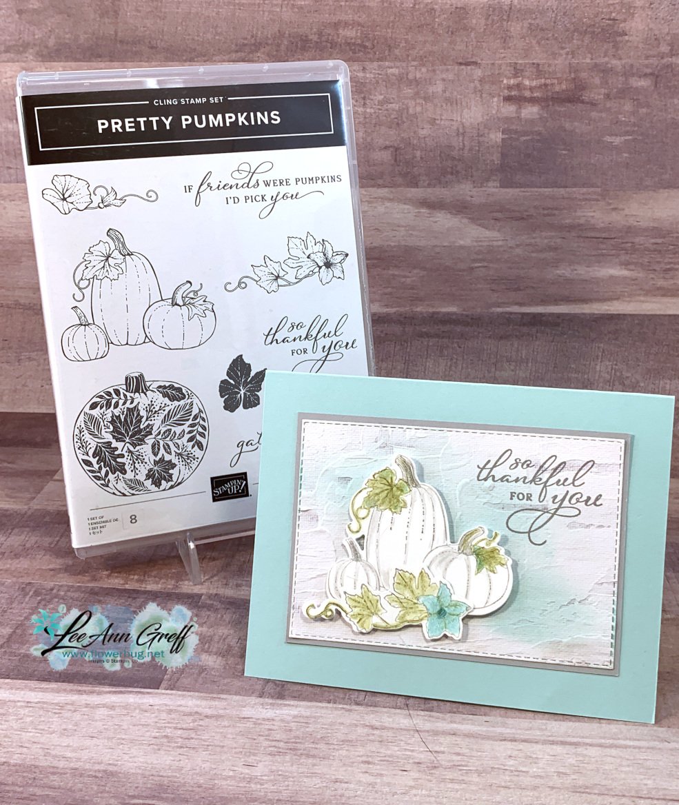 These pumpkin and leaf die-cuts are in the Detailed Pumpkin dies seen here.  *Save 10% when you purchase the bundle – stamp set & dies. I did fussy cut the greeting after stamping it. The embossing folder is called Brick Wall.