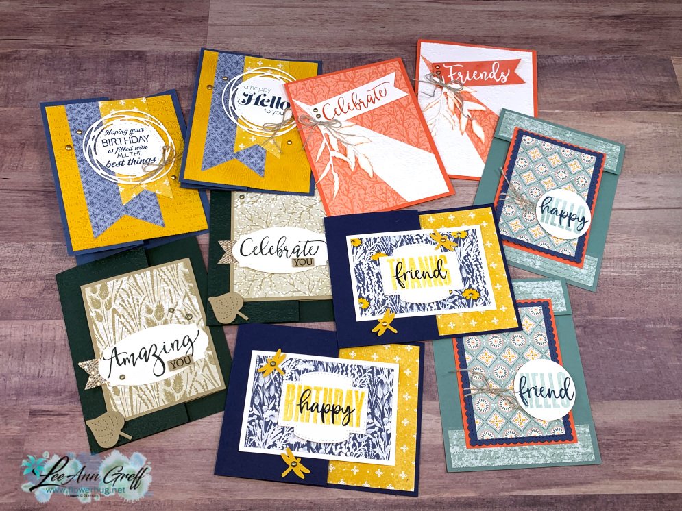 This kit includes 10 pre-cut cards (2 each of 5 cards), 1/2 pkg. Nature's Harvest designer paper (6" X 12"), Metallic adhesive gems & Linen Thread. It's a fabulous value as the product is worth $20 (without tax & shipping) and the cost is just $28 and the tutorial is free! The PDF tutorial includes photos, step by step directions, measurements to make more and a supplies list.