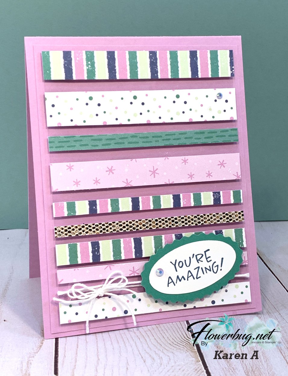 I love how she added two thin banners of the Be Dazzling paper under her greeting.  This paper is absolutely amazing.  There is no glitter released and it has so much glitz & shine a little goes a long way!