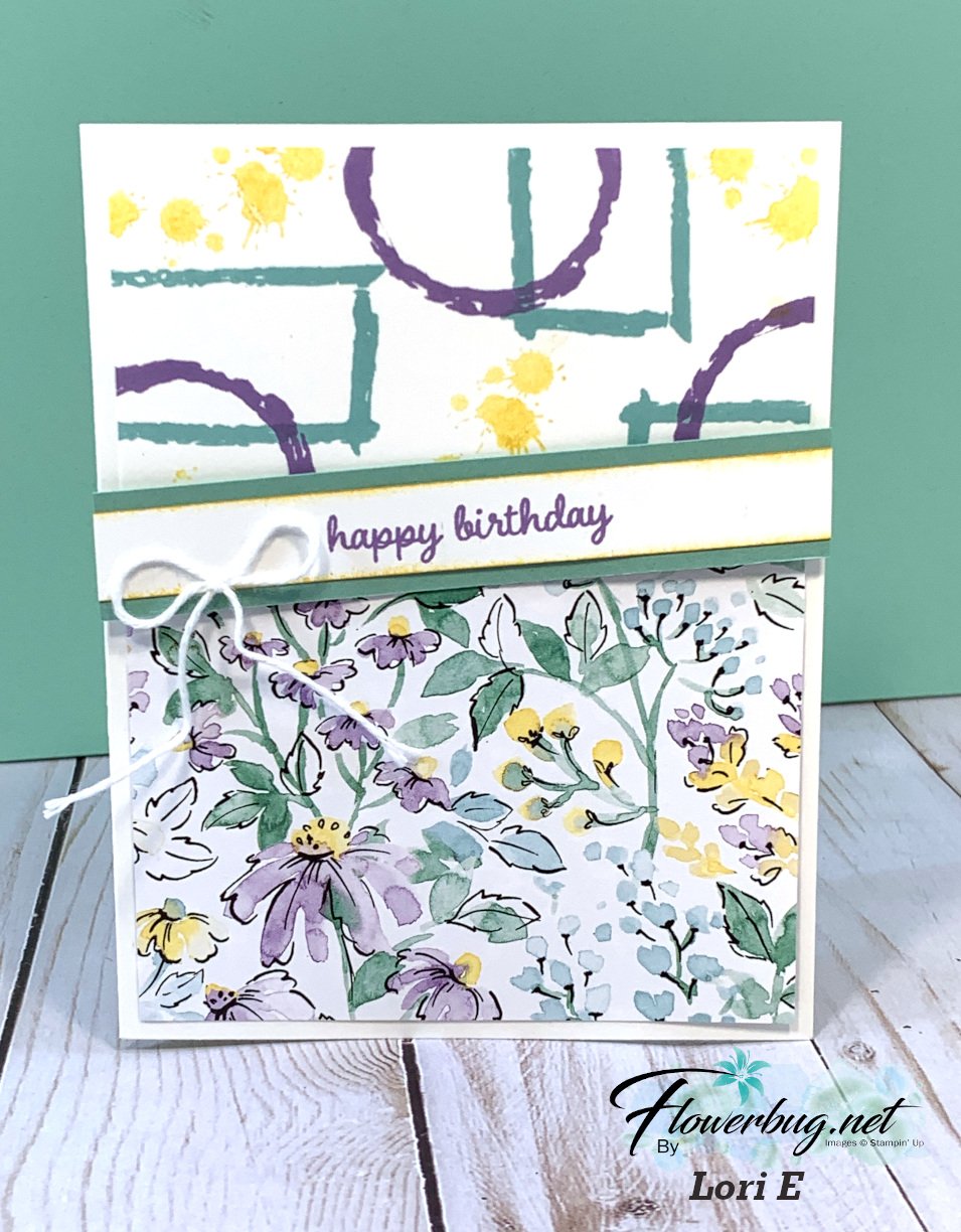 Next is Lori's card featuring the Textures & Frames stamp set & Hand-Penned designer paper.  What a fun background she stamped on the upper panel!  She used the colors in the DSP – Daffodil Delight, Soft Succulent & Highland Heather.