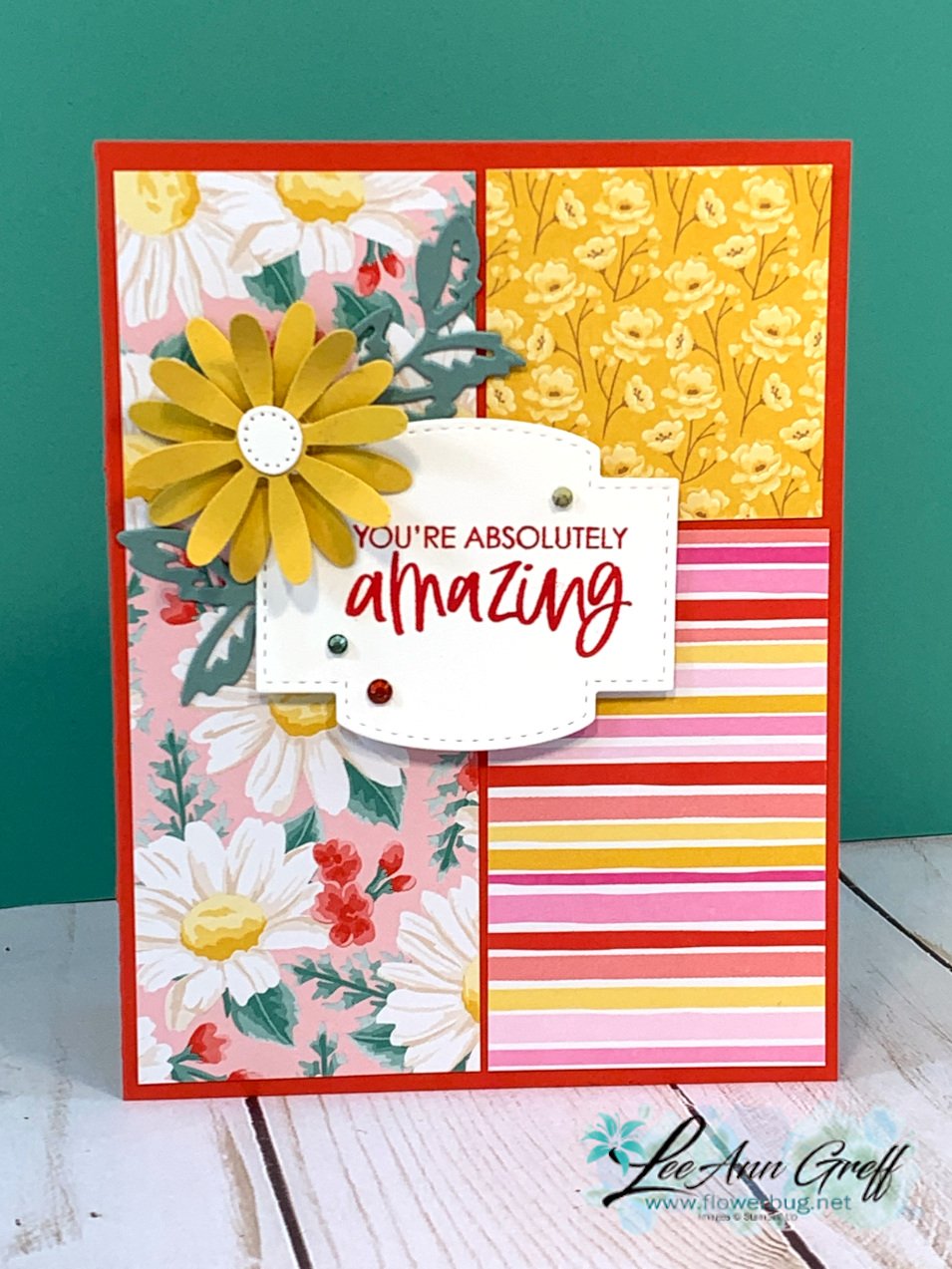 I used the new In Colors of Soft Succulent, Fresh Freesia, Pale Papaya and Polished Pink. The only one I didn't use is Evening Evergreen. That pretty greeting die is also included in these Meadow dies! Can you see the shimmer on the flowers? I added a bit of Wink of Stella. The embossing folder is Tasteful Textile.