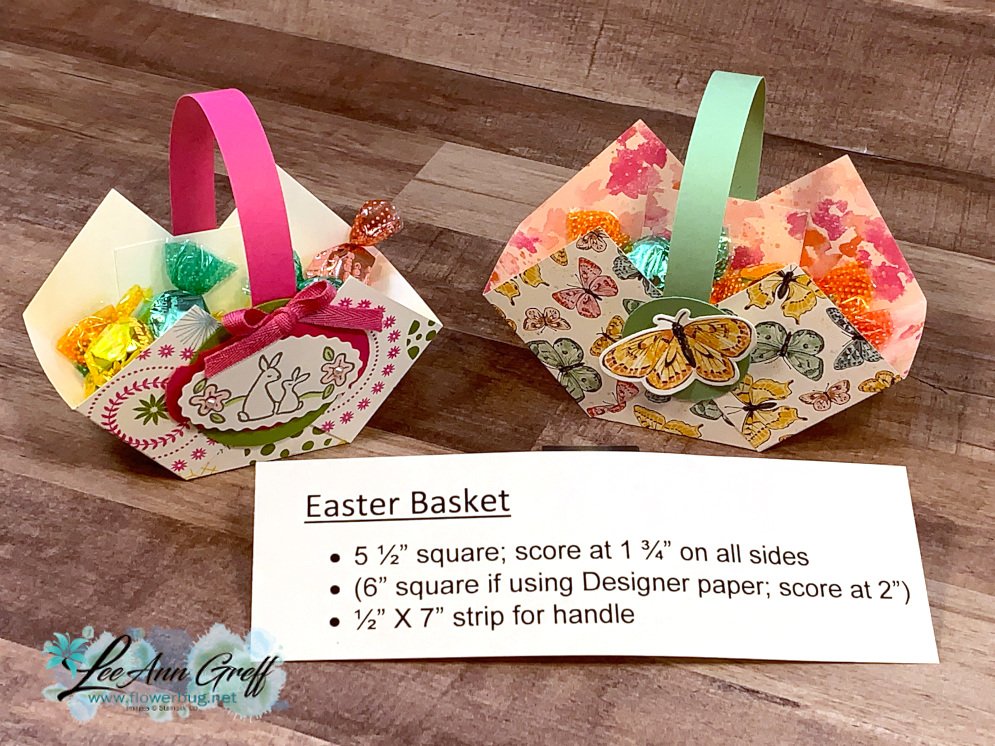For the butterfly basket on the right I used a 6 X 6" square of Butterfly Bijou designer paper. Unfortunately this paper is sold out now. They hoped to have enough through May but we all loved it so much they ran out! I'm so sorry about that.