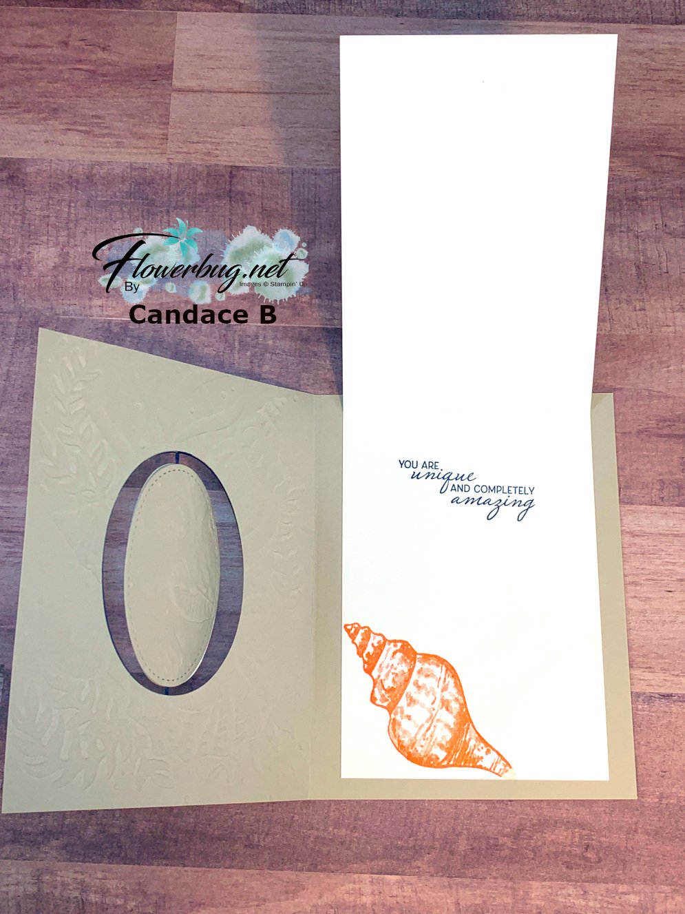 Her colors are Crumb Cake with Soft Suede & Vanilla. That great texture is from the Tasteful Textile folder in the annual catalog. Adding a bit of color to the balloon really makes it stand out! Take a look at the inside!