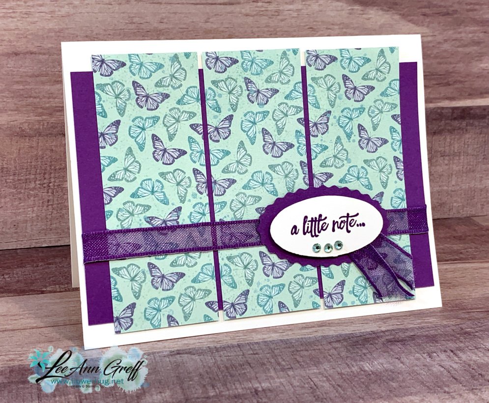 I used the Double Oval punch for the greeting which unfortunately is unavailable right now; they've run out! But it will be at the end of March. The stamped greeting is from the Enjoy the Moment stamp set on page 59 in the Spring catalog. This pretty Grape ribbon is also unavailable; it should be back next week.