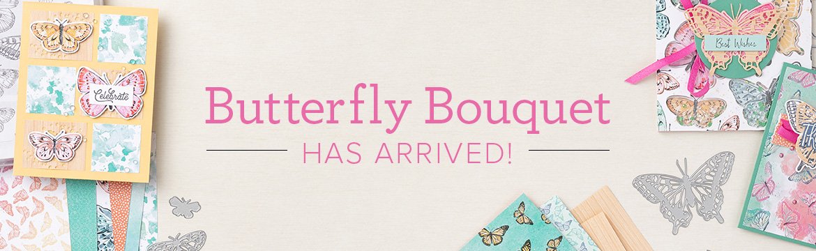 The bundle consists of 1 large butterfly stamp and 12 coordinating dies.  There is a big pack of 6 X 6" Butterfly Bijou Designer Paper and also new Natural Touch specialty paper; 2 sheets of wood grain 12" X 12" paper. Download the Butterfly Bouquet flyer
