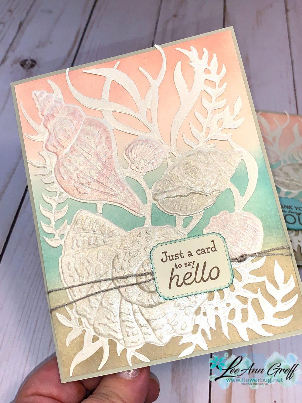 We made this gorgeous card at my February card clubs.  Everyone was amazed at how beautiful this die-cut is once it's stamped and textured with the Seashells embossing folder.