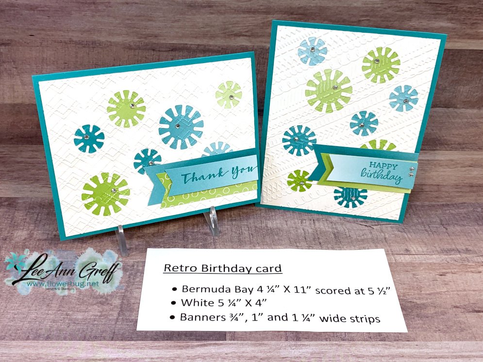 Next I played with the Dandy Wishes dies (2021 Spring Catalog) to create these 'Retro' style cards.  I first die-cut a bunch of 'windows' in the White panel.  Then added punched circles of the Oh So Ombre DSP behind them.  Next I textured the entire thing with an embossing folder.