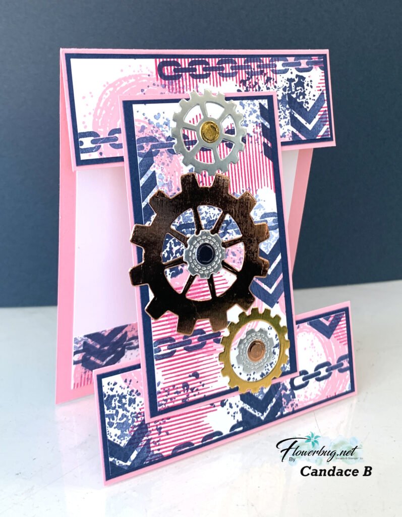 She made her own paper with the stamps in the set. She used Pretty in Pink, Night of Navy & Flirty Flamingo inks. She added die-cut gears from the Metallic Textured Specialty papers seen here.