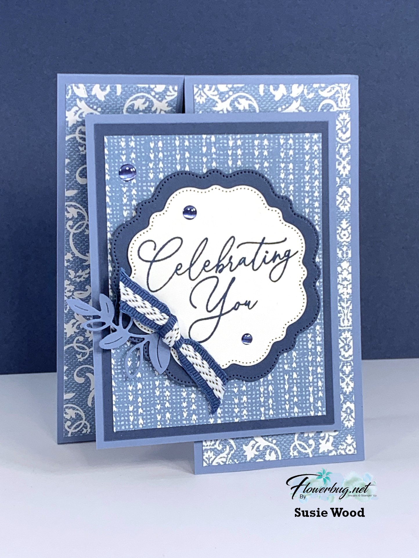 This card features Misty Moonlight, White & Fresh Freesia. The pretty paper is the Flight & Airy designer paper from our Sale-a-Bration catalog. It's free with a $50 order. See it here.