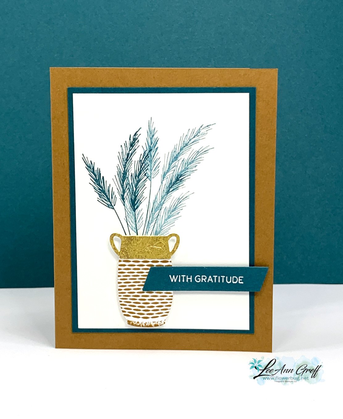 I stamped the vase in Pecan Pie on Basic White and die-cut it out.  Then added another die-cut of the handles from our Gold Distressed paper. The greeting is heat embossed with White embossing powder on Pretty Peacock card stock.