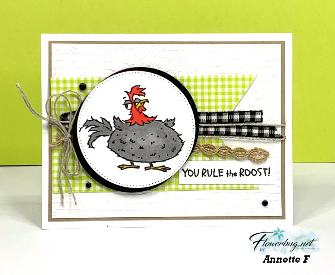 The card above shows that adorable rooster at it's best.  She paired it with gingham accents in Glorious Gingham DSP and our Black & White gingham ribbon. She colored her rooster with Blends markers.