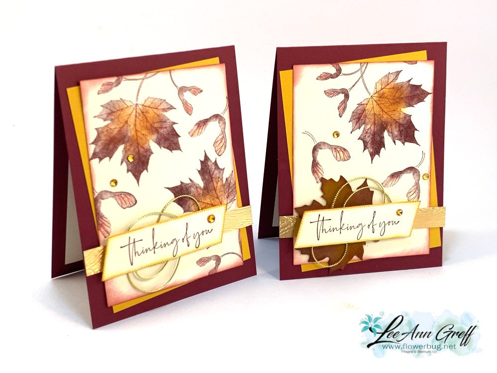 Besides the Gorgeously Made stamp set (seen here) I chose the Layering Leaves (seen here) for the pretty greetings and leaf images.