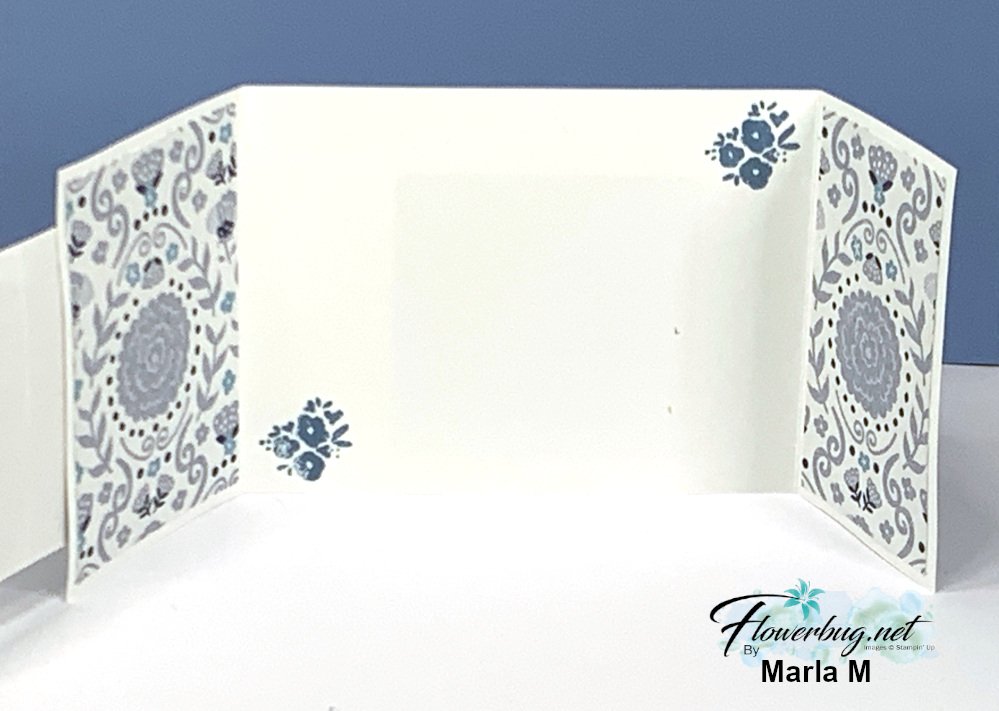 If you want to make a card like this start out with a 4 1/4″ X 11″ piece of card stock scored at 5 1/2″. Trim off a 1 1/2″ piece from one end. Then trim off another 2 1/2″ piece which is the vertical center piece. The stamped paper layers are 1 1/4″ X 4″ on the top & bottom and the center is 2 1/4″ X 4″.