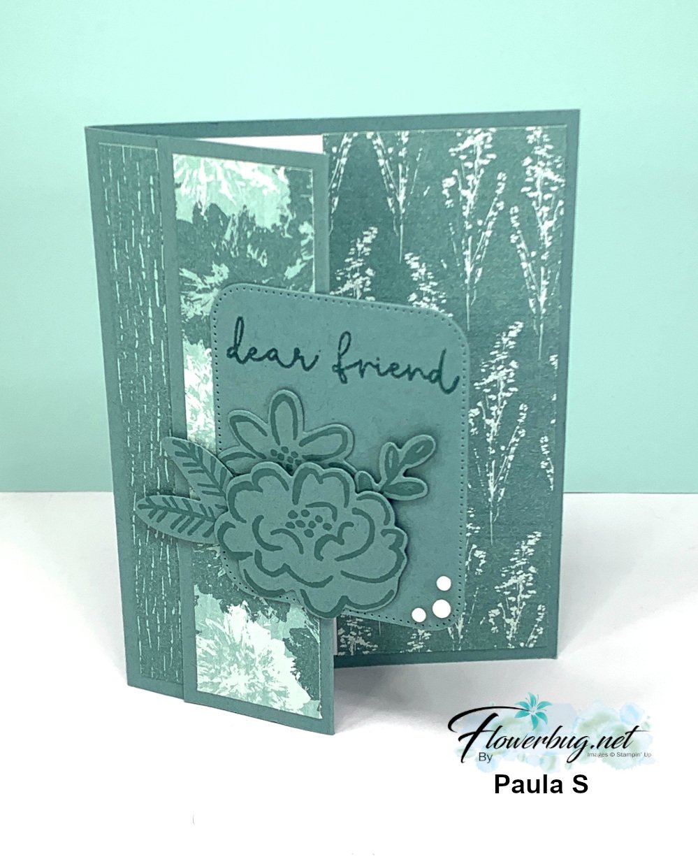 Next is Paula's card; it's a fun fold card featuring the Inked Botanicals designer paper. It's another monochromatic card! She folded back her front card base to show off the designer paper on the inside.