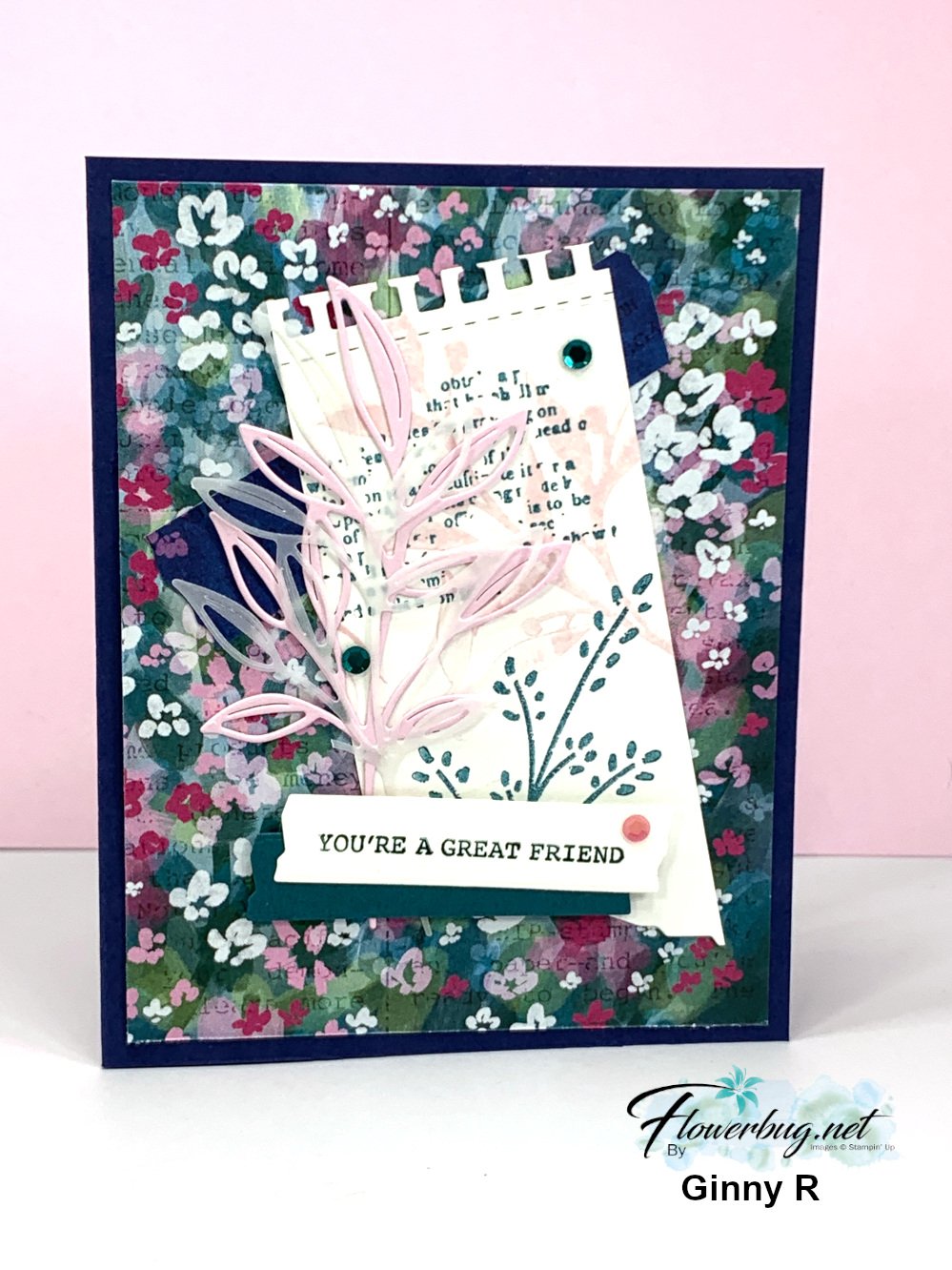 She made her own paper with the stamps in the set. She used Pretty in Pink, Night of Navy & Flirty Flamingo inks. She added die-cut gears from the Metallic Textured Specialty papers seen here.