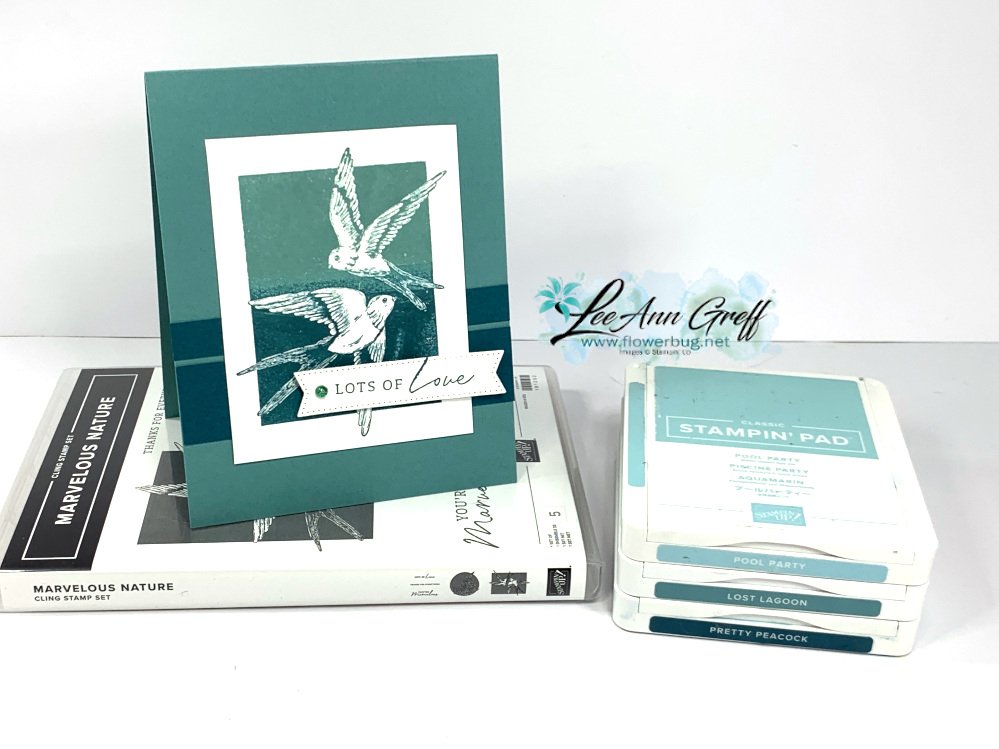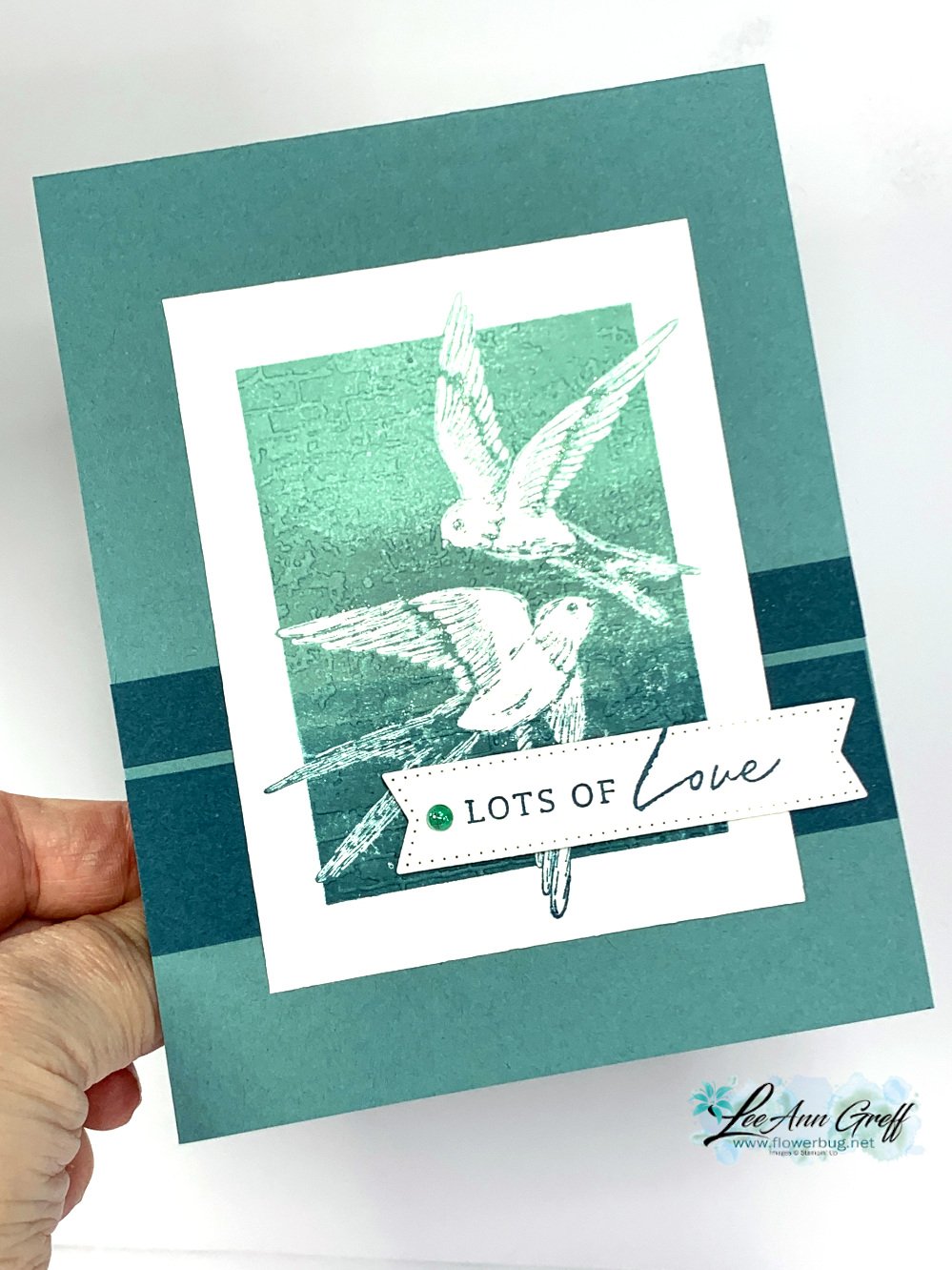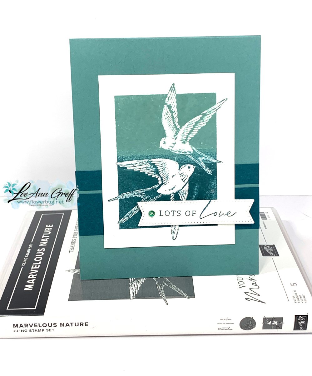 The card base is Lost Lagoon with two strips of Pretty Peacock under the main image.  As you can see by the photo below the left card is lighter than the right one.  In the video I went over the upper part of the image one more time using the Stamparatus; mostly so I could get a more solid, complete image.