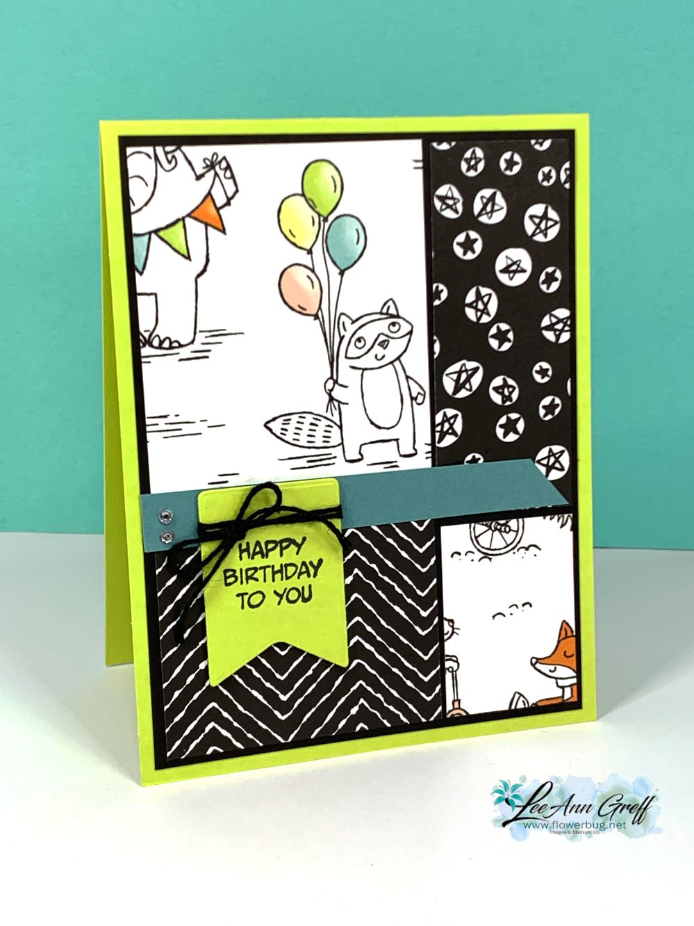 I simply used a few pieces of the Zoo Crew designer paper and added a stamped flag greeting with twine on a long strip of Lost Lagoon.  Cute & Quick!