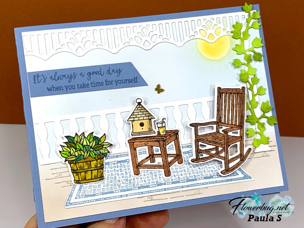 See what I mean?  The scene she created is so real & life-like!  This card features the new Lazy Days bundle seen here.  And she used many of the stamps & dies in the bundle.  I counted them – 9 stamps or dies!