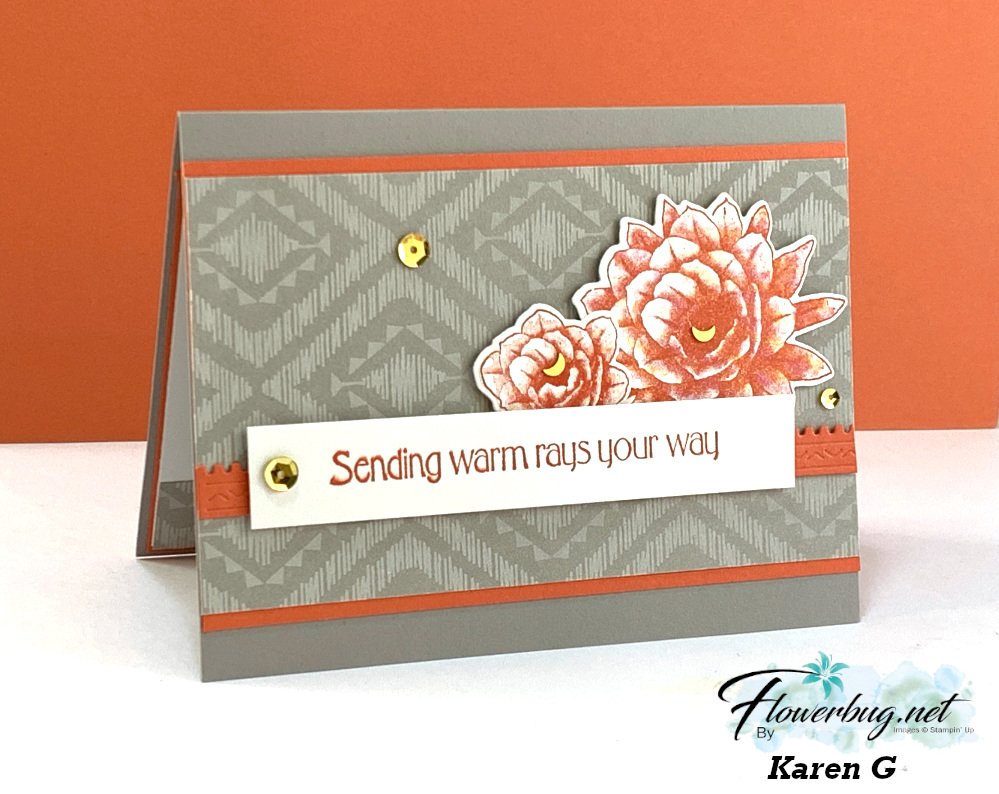Her colors include Gray Granite & Calypso Coral with White & Gold.  The greeting, pretty flowers and border die are all from that Desert Details bundle seen here.