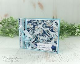 This next card is a Book Binding fold. Her card base is Balmy blue and that pretty shell designer paper is adhered to narrow White layers.