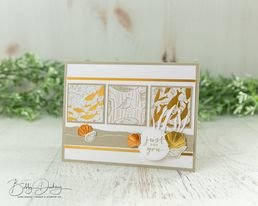 The seashell is cut from the Texture Chic DSP and the greetings are cut from the Stitched Rectangle dies.  Love that foil sea grass accent!