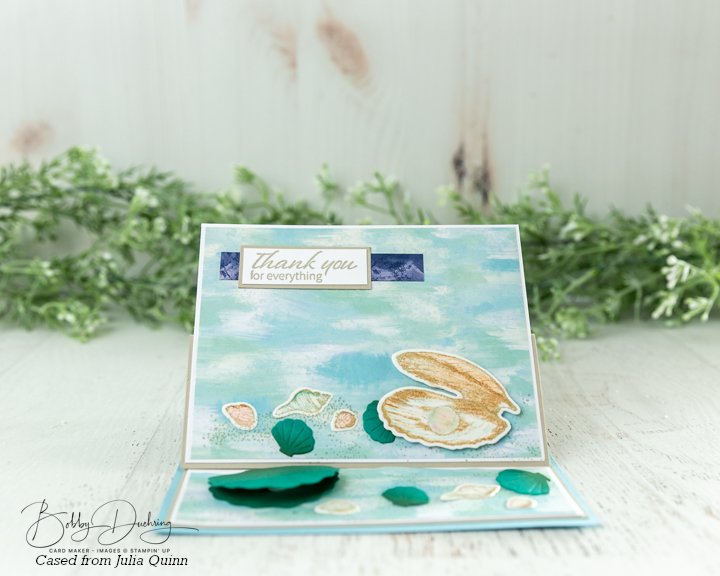 Her next card is an easel card and it shows off the clam shell die in the Seaside Bay bundle.  It is scored and hinges open to reveal a pretty pearl gem inside.