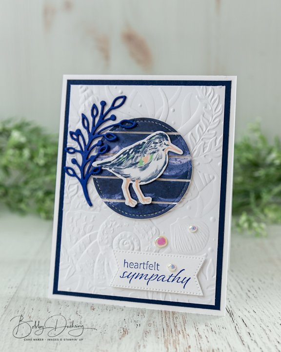 The bird is cut from the By the Bay Designer Series Paper. Leaf Sprig is from the Framed Florets and the embossing is from the Seashells 3D embossing folder in the annual catalog.