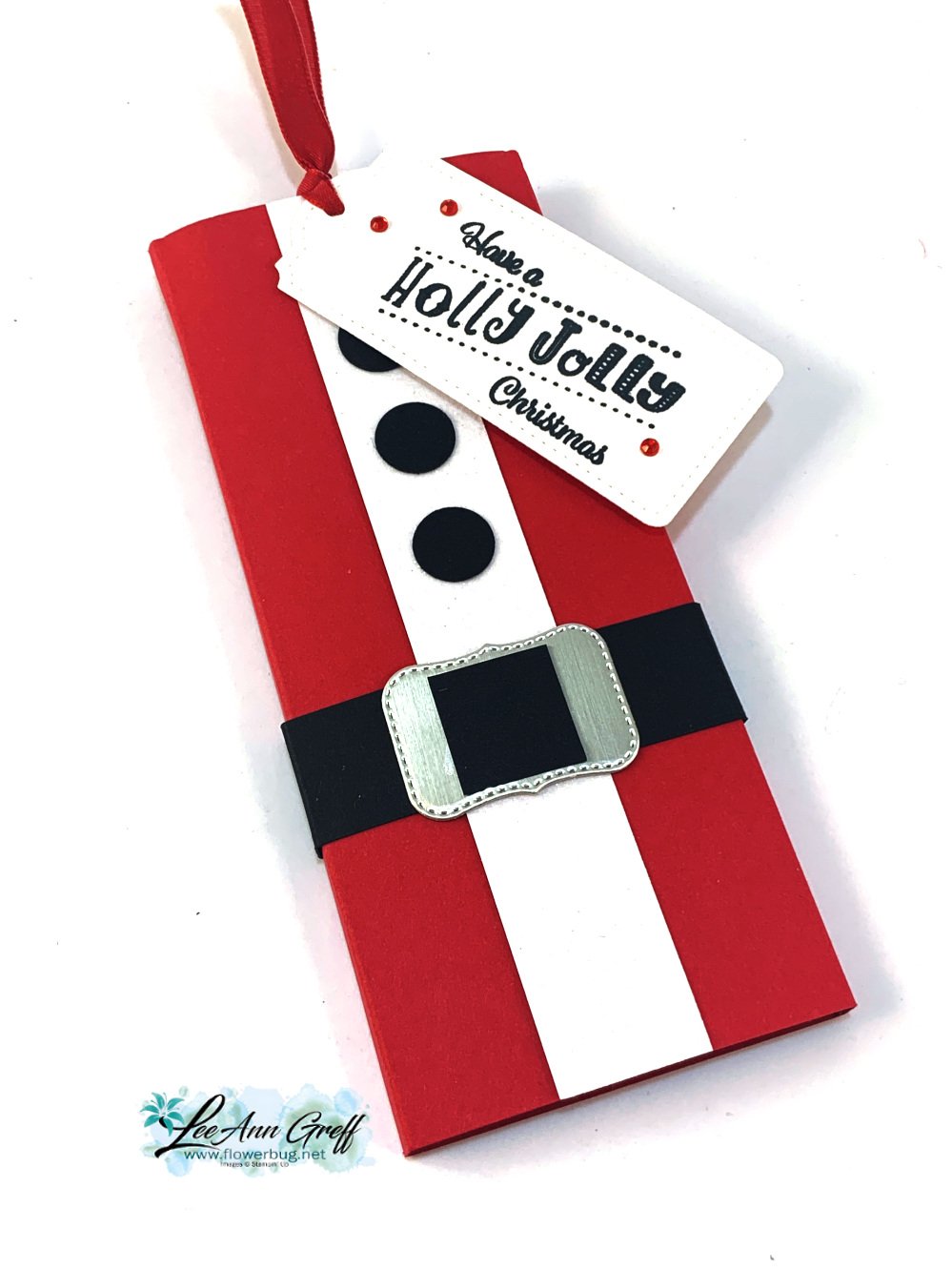 When you pull the ribbon it brings the candy bar out of the 'suit'.  So fun! And quite easy to make too.  It fits a standard full size Hershey candy bar but would likely work for others too.