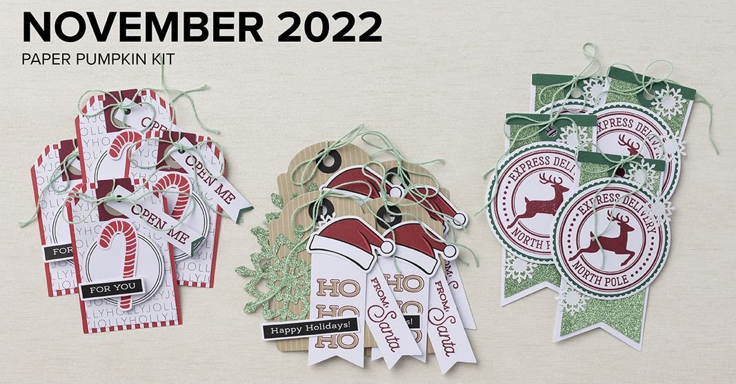 If you don't like or need tags, they can easily be changed into Christmas cards.  This kit is available in a refill for just $11 while supplies last. The refill kit does not include the stamp set or ink spot and is only available to current Paper Pumpkin subscribers.  Here's a link to it.