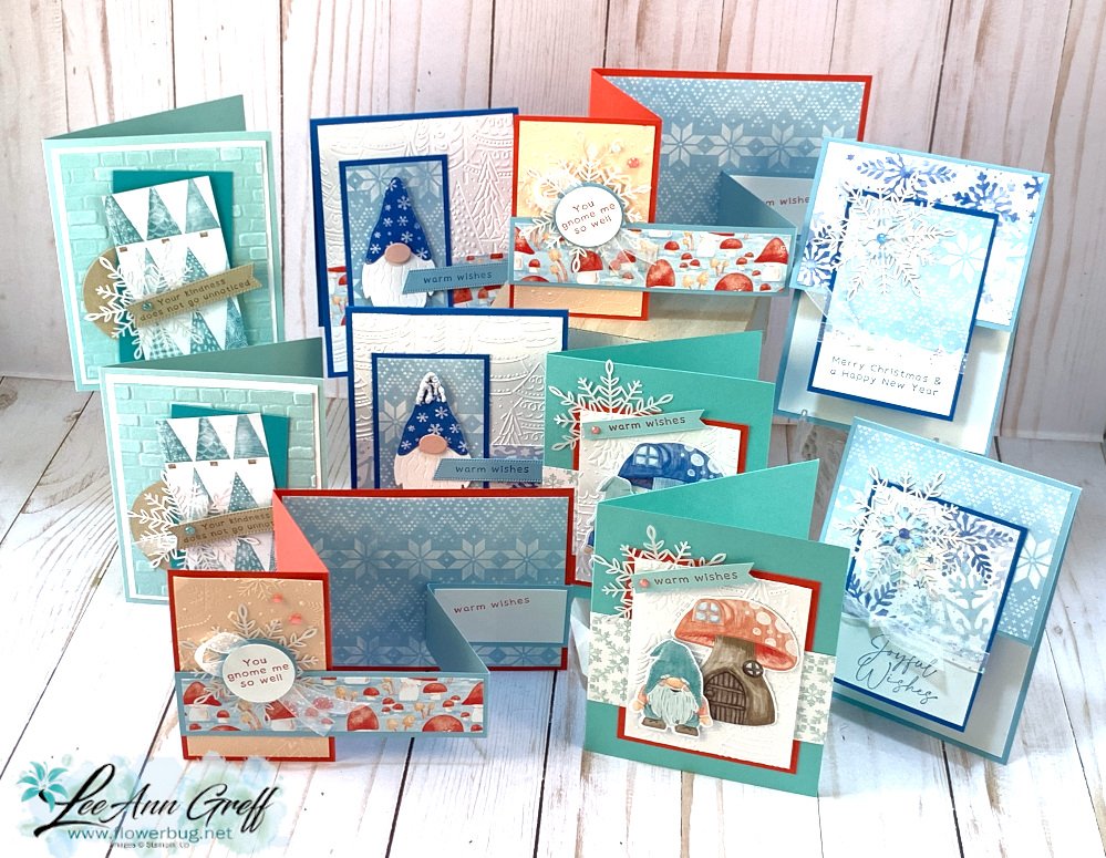 Even if you aren't a 'gnome' person you'll love these cards.  They're filled with snowflakes, Iridescent ribbon and sparkly gems; two of the five are fun folds and one is interactive!  The Designer paper has many choices; some with pretty 'wintery' backgrounds plus scenes with gnomes.