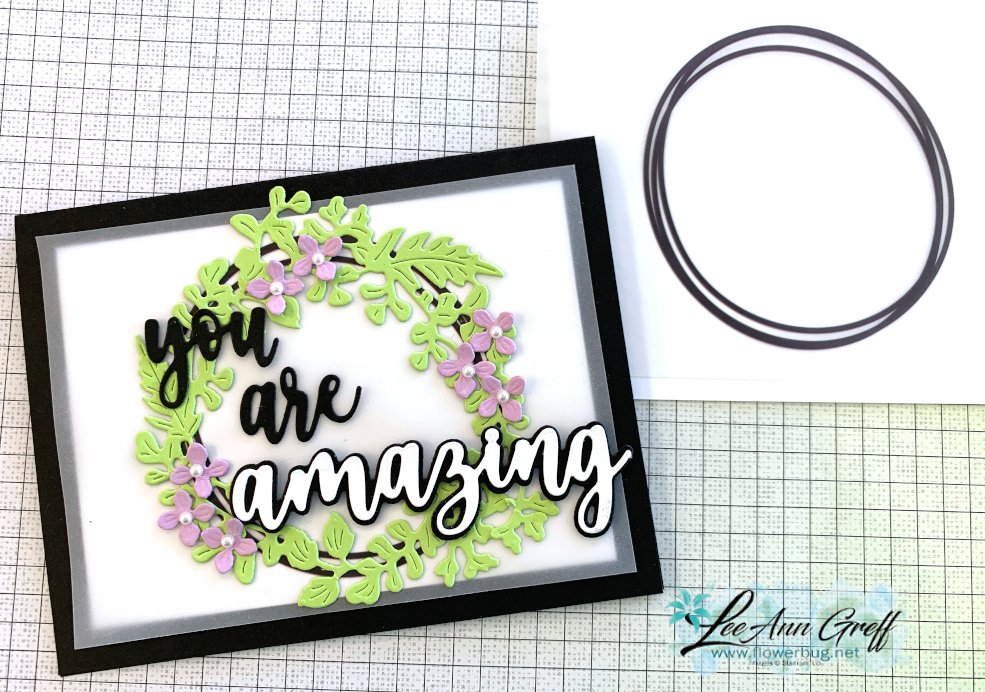 This first card has a printed circle on it.  The easy solution was to add a die-cut wreath.  I used three sets of dies here; the Natural Prints, Amazing Thanks & Hydrangea dies.