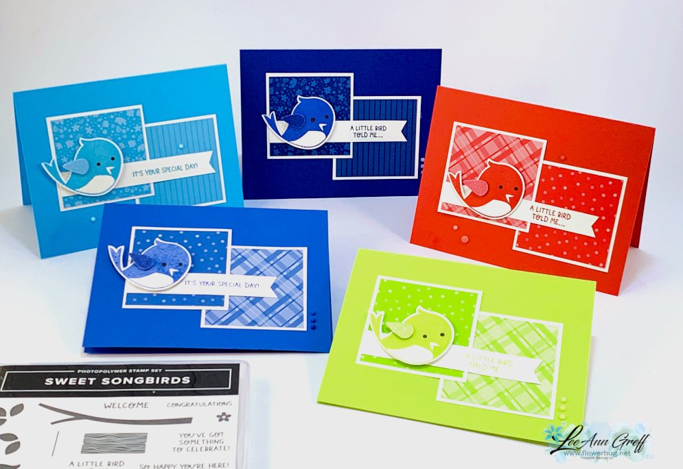 For my In Color display board I made these 5 cards with the new Sweet Songbirds stamp set & punch bundle.