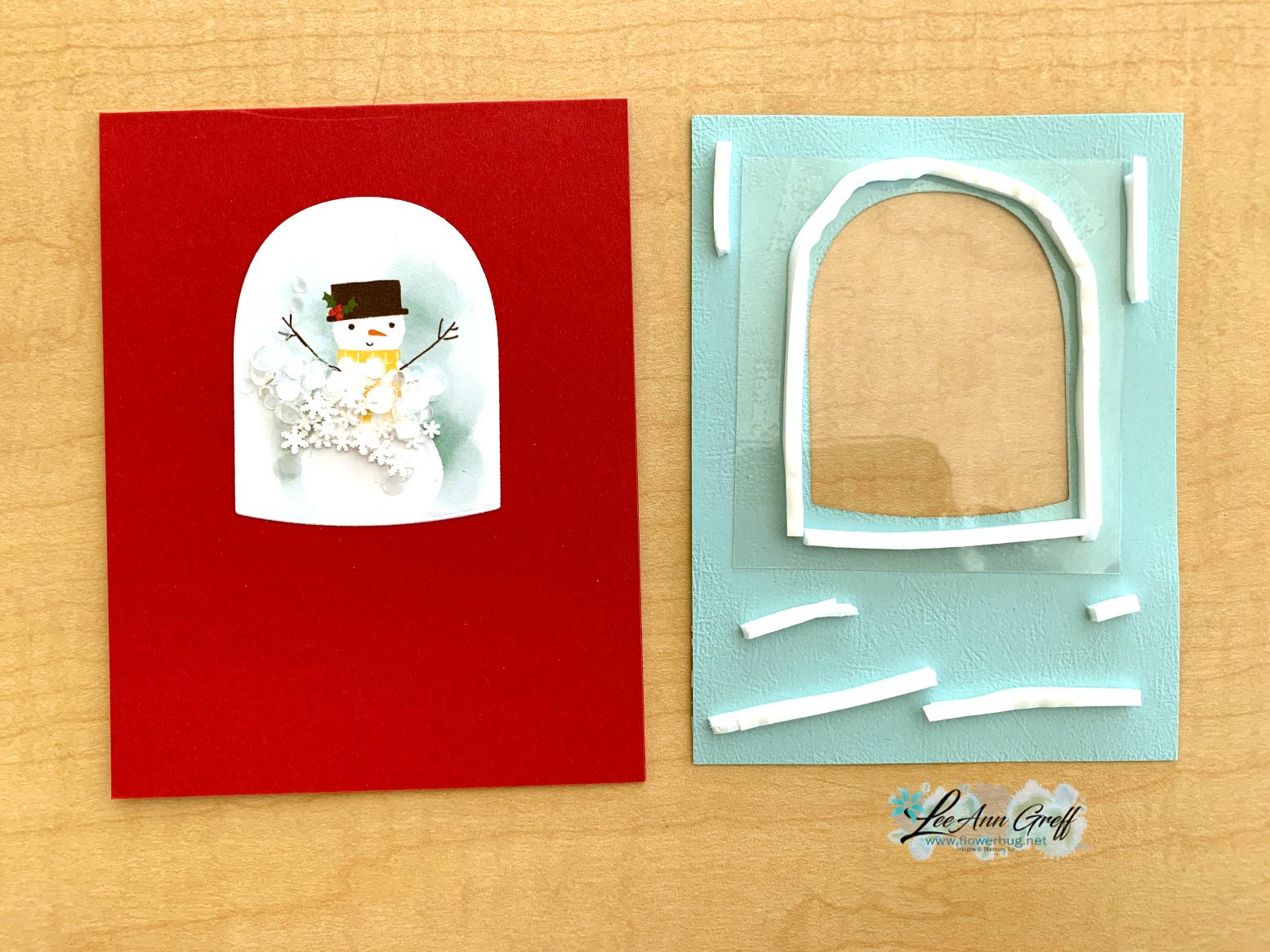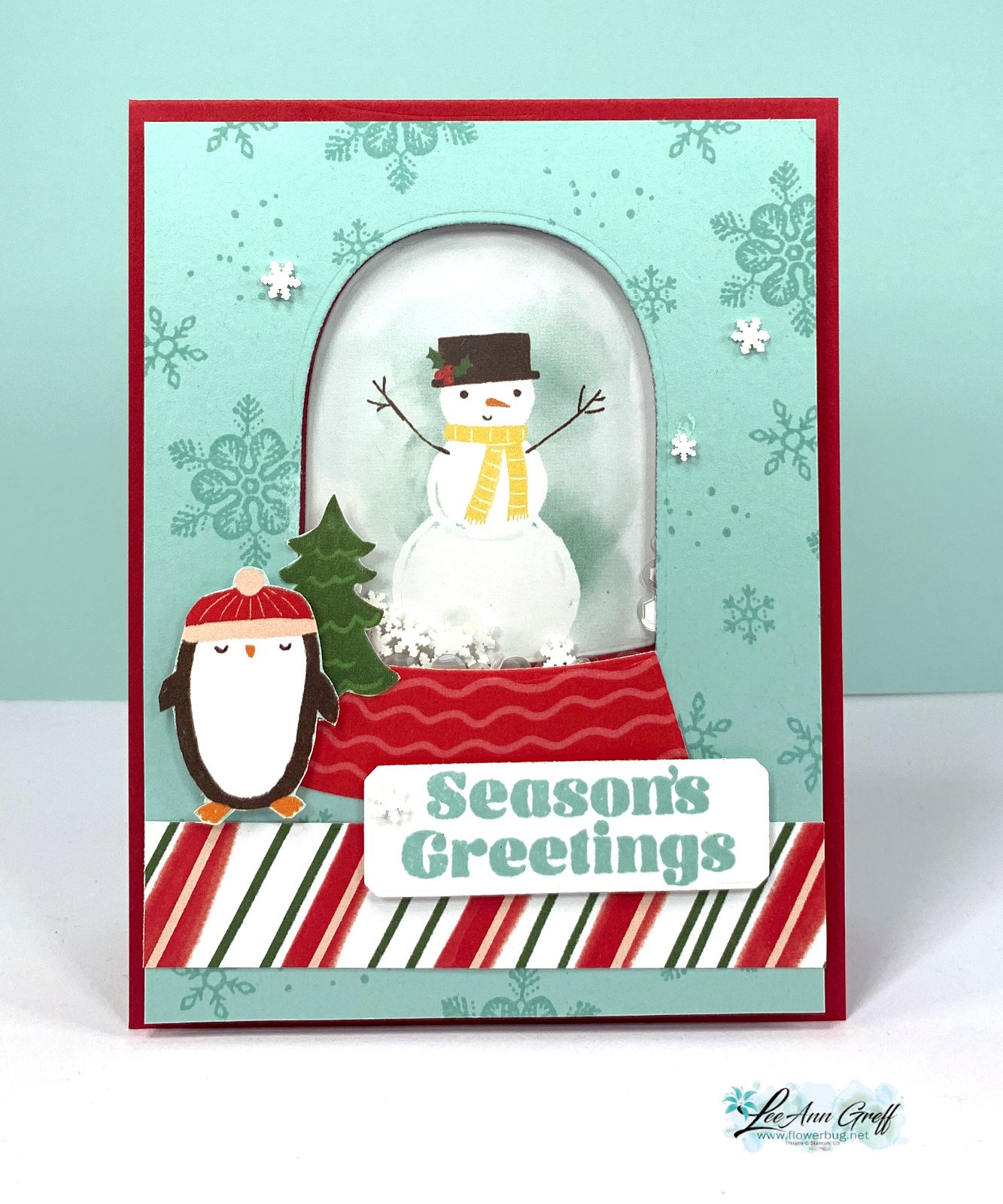 Below you can see how you assemble the shaker card. We used the Pool Party window layer to position the snowman die-cut on the Red card base. Then we stamped the Pool Party layer with snowflakes. Next lay your shaker elements on that as shown below.