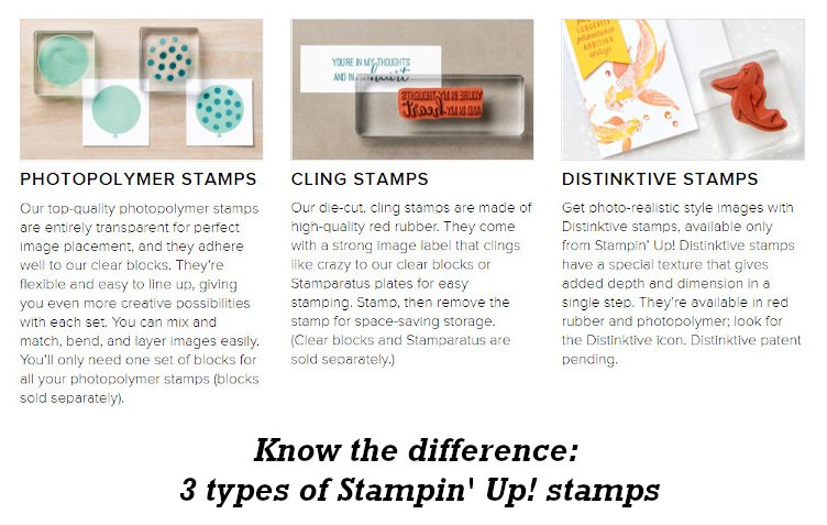 Lastly is a list of the three types of stamps Stampin' Up! offers.  It might be hard to read so I'll share the details in this list: