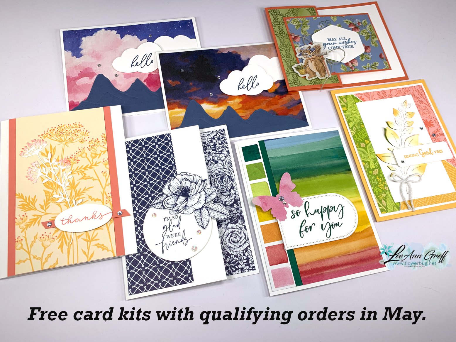 Earn free card kits in May with online orders! Get 4 kits with a $60 order and orders over $80 receive all 6 cards. All you need are greetings, gems and adhesives to assemble.