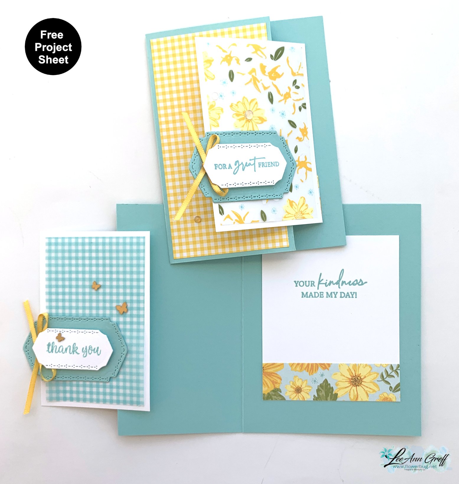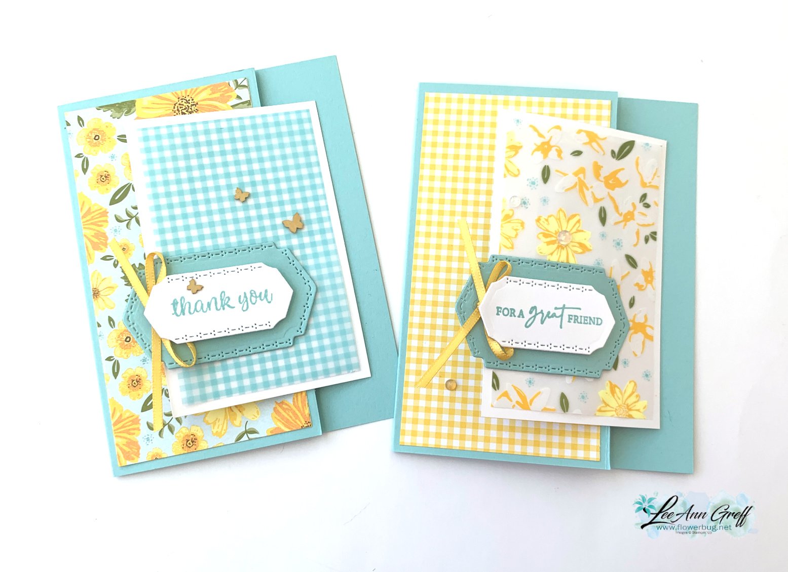 I used the Floral Delight designer paper here along with the Floral & Gingham Vellum too.  The center piece is the vellum – the blue gingham and the yellow flowers on the right card. I used our Multipurpose Liquid glue to adhere it and it didn't show a bit! Use a very light hand for success here.