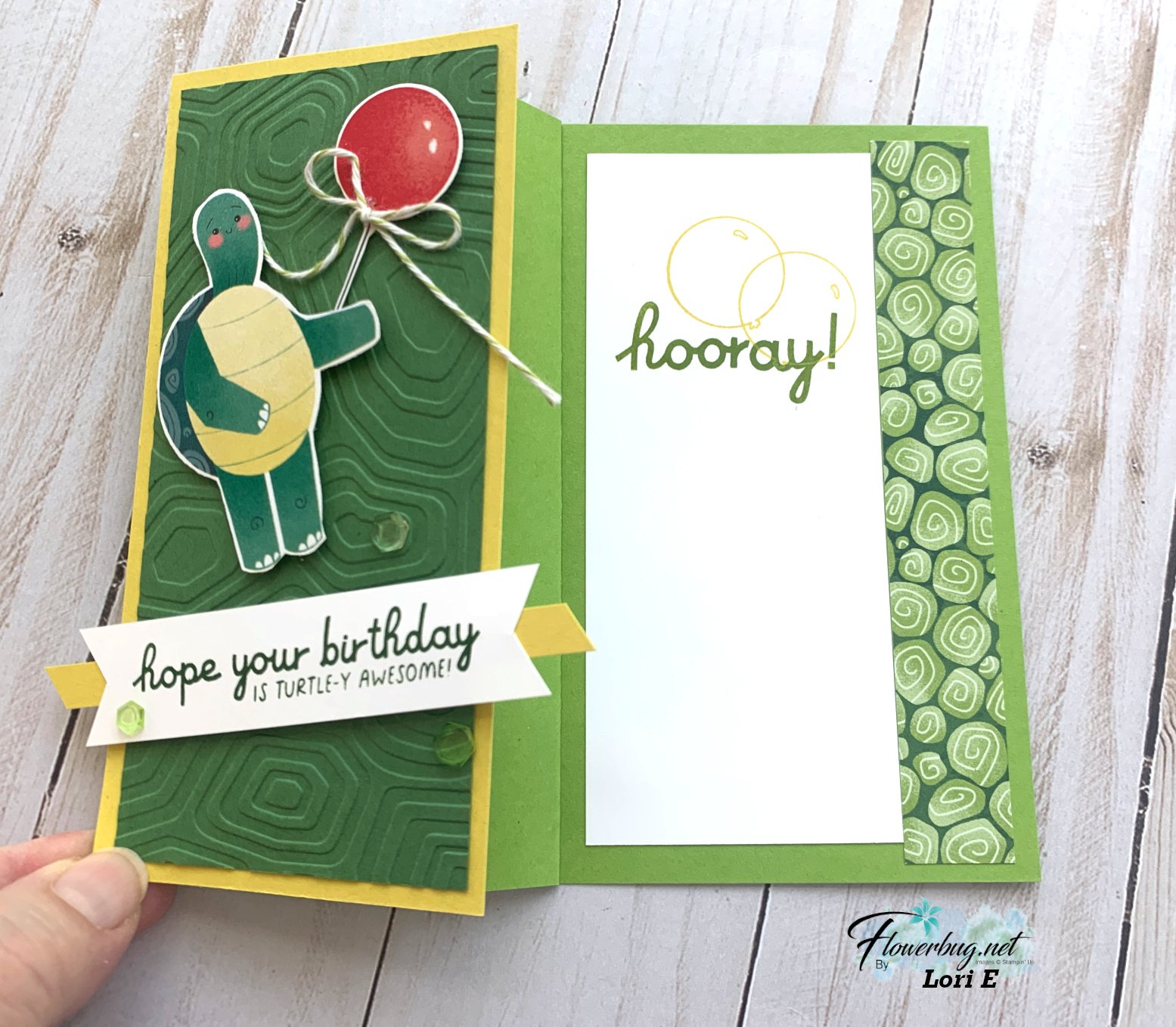 She used the Turtle-y Cute suite seen here. So many fun elements! Unfortunately the Turtle Textures embossing folder is currently unavailable.