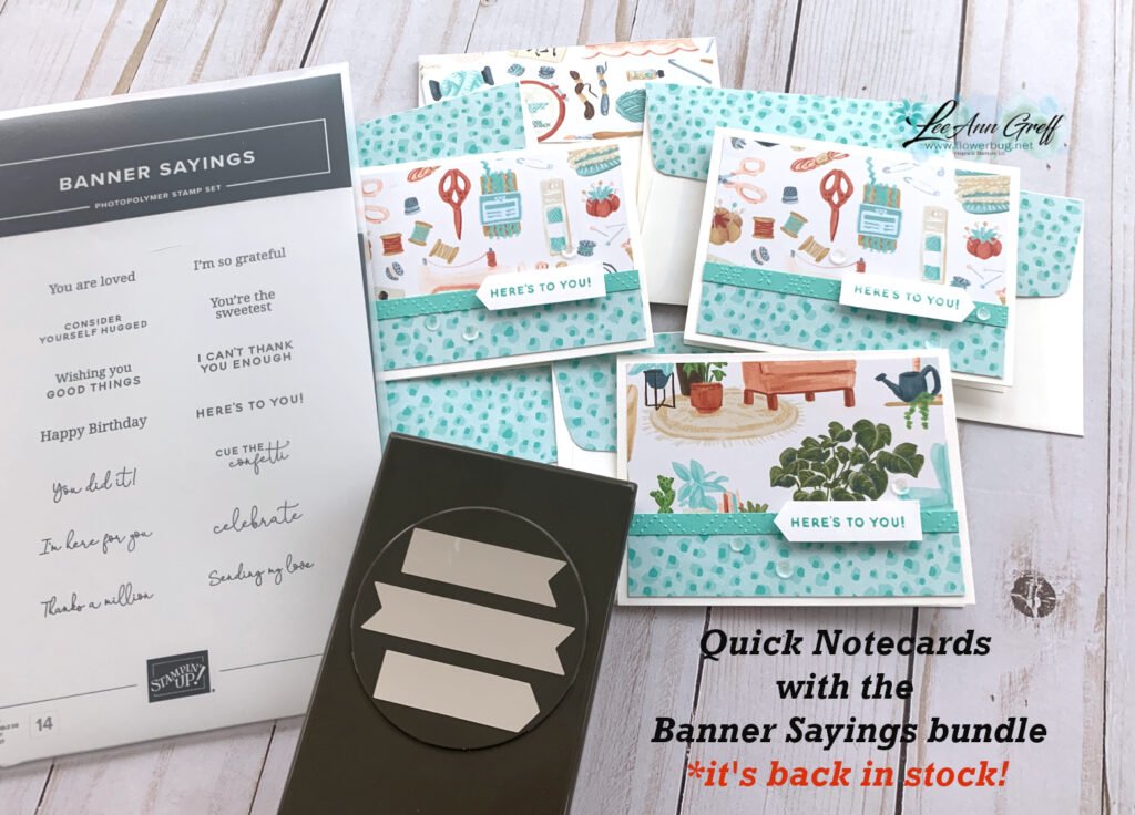 I decided to feature the Banner Sayings bundle for a few reasons. It’s quick with the coordinating punch and the greeting I chose fit my needs perfectly. Click here to see it. The new Triple Banner punch was out of stock for weeks! But now it’s back.