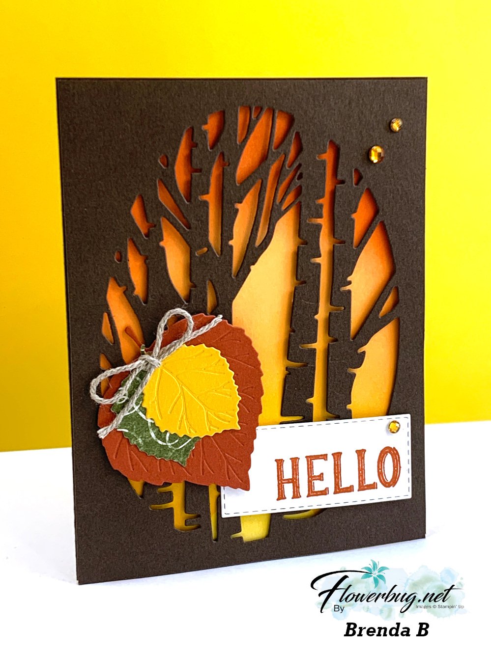 She die-cut the large die from Early Espresso card stock and added a few die-cut leaves, also from the Aspen Tree dies set.  The 'Hello' is from the Hello Harvest stamp set, stamped on a white stitched rectangle die-cut.