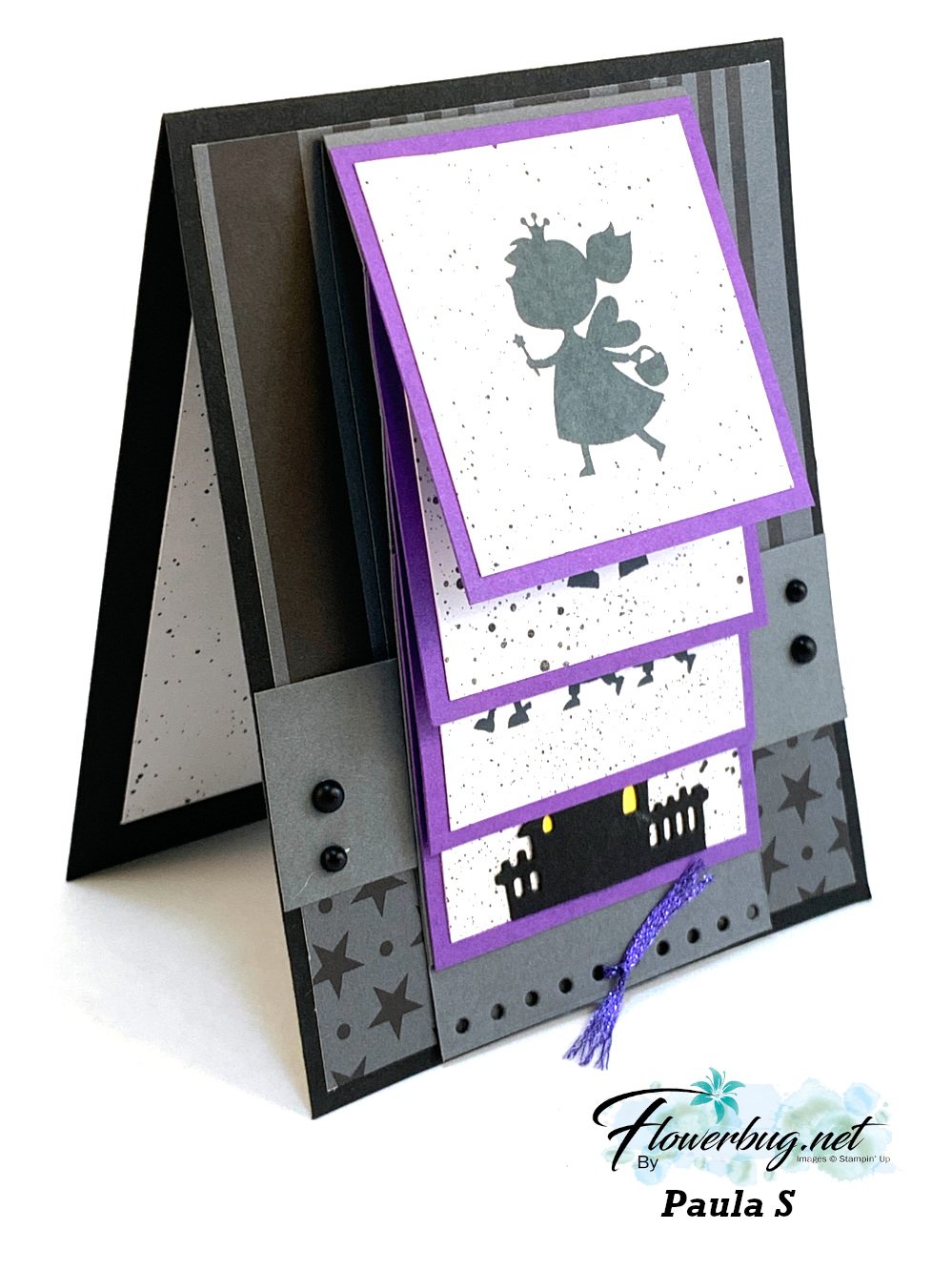 She used Gorgeous Grape, Pumpkin Pie, Black & Granny Apple Green.  She cut off the front flap with the Border Basics dies and added a strip of Gorgeous Grape with the same die-cut edge.